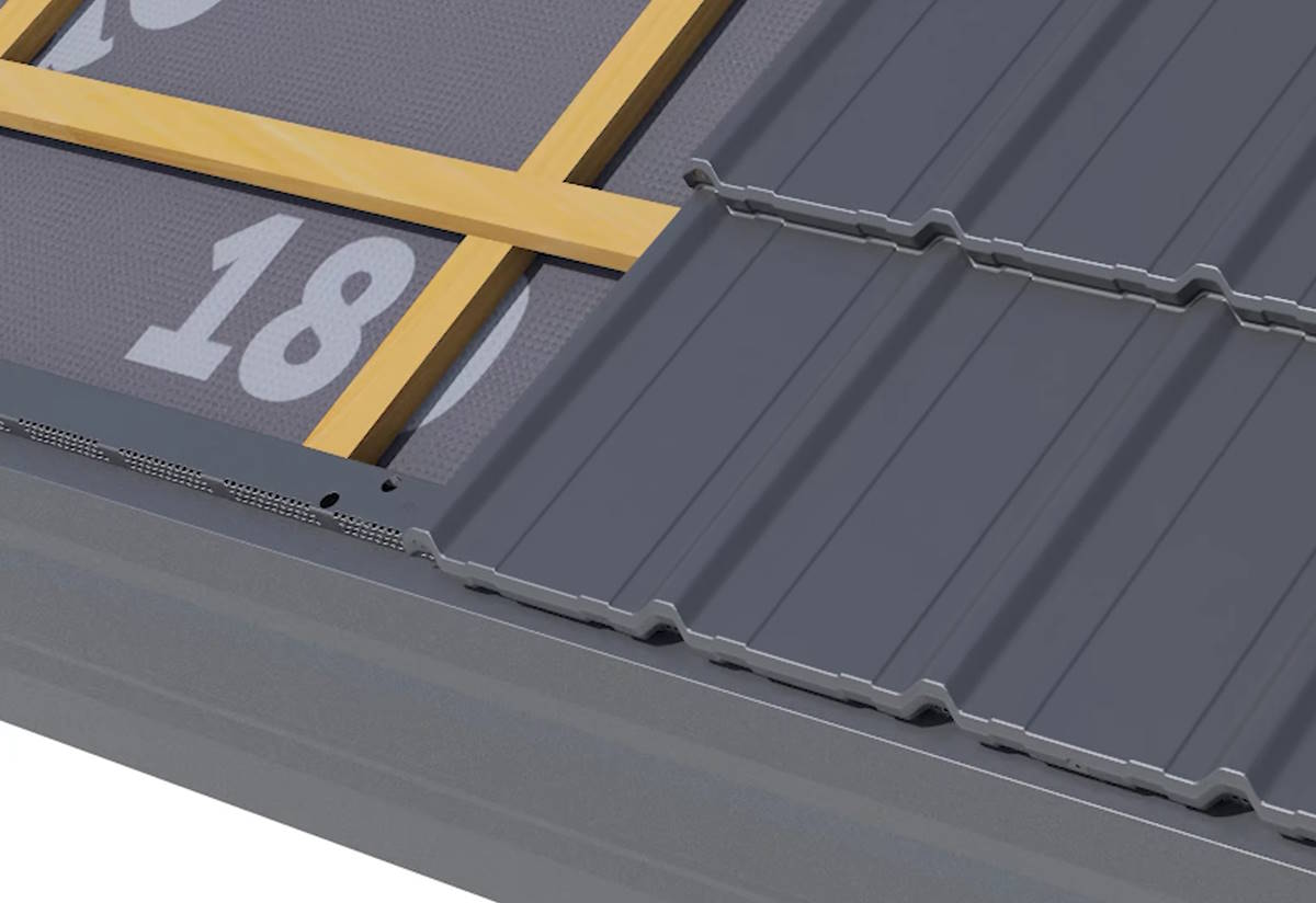 * вентиляционный зазор обрешетки вместе с вентиляционной поверхностью под волнами кровельных модулей обеспечивает вентиляцию на уровне 200 см²/погонный метр карнизного свеса, что соответствует требованиям DIN 4108-3:1996.