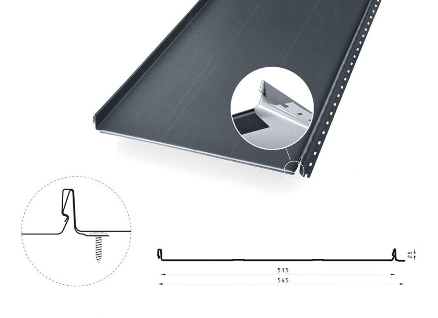 • 25 мм подгиб замка панели со стороны карниза, а со стороны конька прямой 25-миллиметровый выпуск (без подгиба)