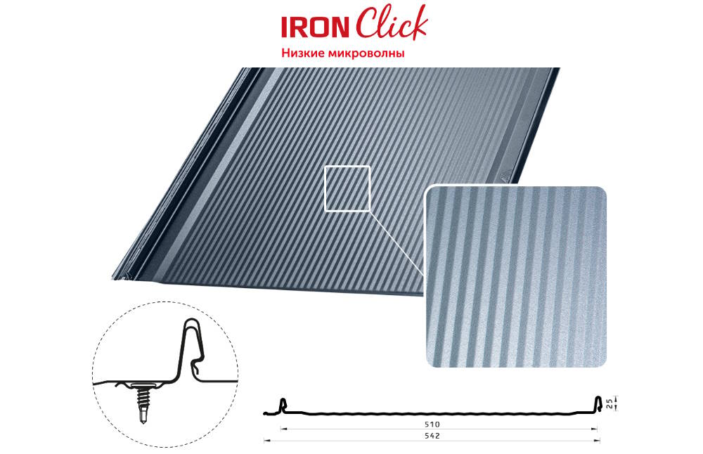 Специально для линии фальцевых панелей IRON мы разработали новый усиленный замок, который обеспечивает более точные и прочные продольные соединения. Инновационное профилирование замка делает кромку верхнего замка скрытой, что значительно улучшает эстетические свойства кровли.