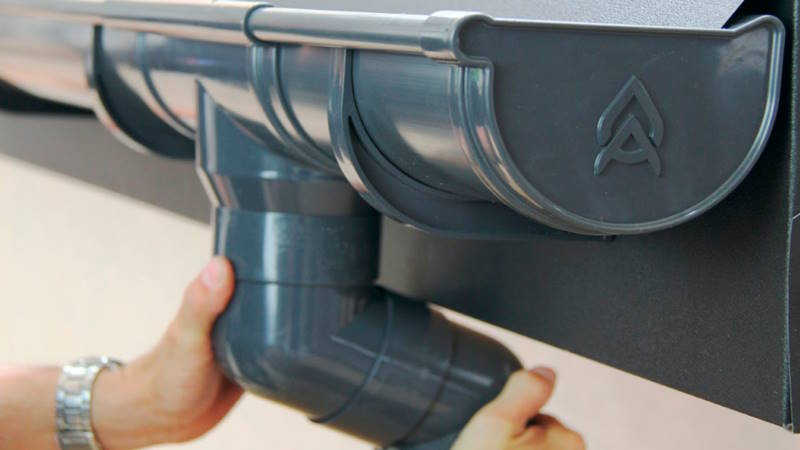 Proaqua – в отличии от остальных водосточных систем это, хомут имеет уплотнительное кольцо для защиты от выпадения болта из хомута трубы, метки - индикаторы (стрелки), указывающие направление установки, возможность монтажа желоба на кронштейны как со стороны карнизного свеса, так и со стороны стены, фиксатор в соединении желоба с кронштейном, что создает замок, предотвращающий выпадение желоба после монтажа водосточной системы. Вот почему сборка так проста.